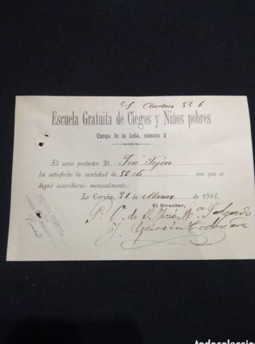 ESCUELA GRATUITA DE CIEGOS Y NIÑOS POBRES. CAMPO DA LEÑA. A CORUÑA. 1914. SUSCRIPCION
