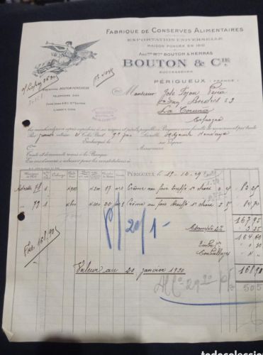 FACTURA FABRIQUE DE CONSERVES ALIMENTAIRES BOUTON. PERIGUEUX.