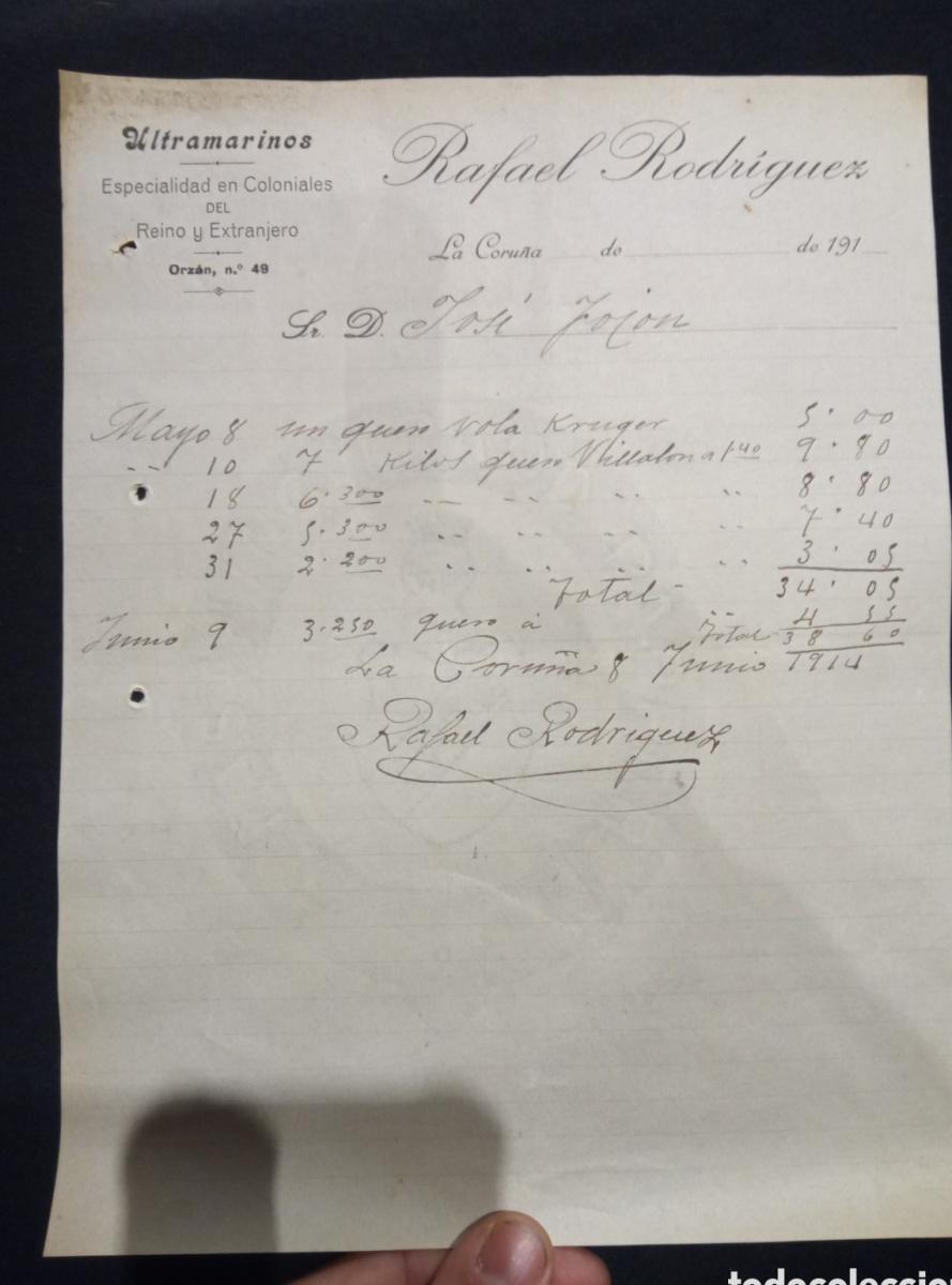 FACTURA RAFAEL RODRIGUEZ. ULTRAMARINOS ESPECIALIDAD EN COLONIALES DEL REINO Y EXTRANJERO. LA CORUÑA