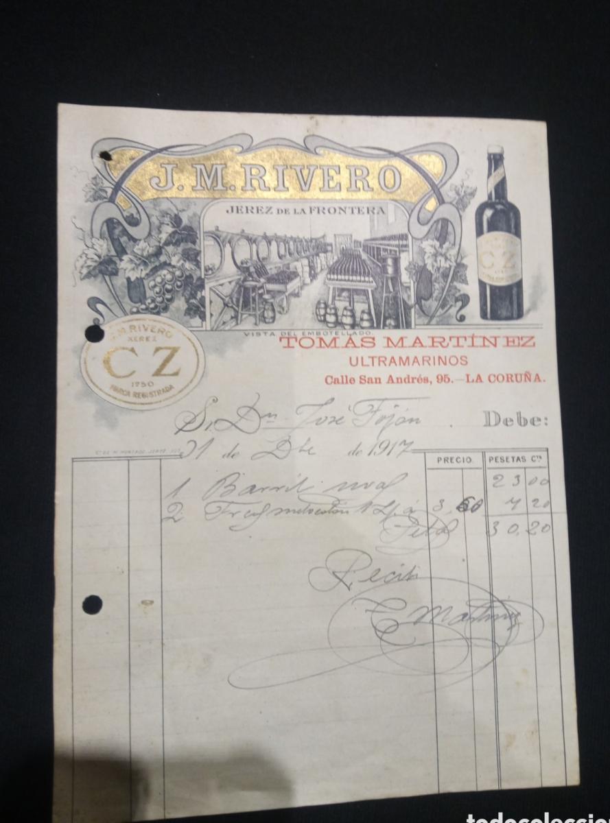 FACTURA TOMAS MARTINEZ. ULTRAMARINOS. J.M RIVERO. LA CORUÑA 1917